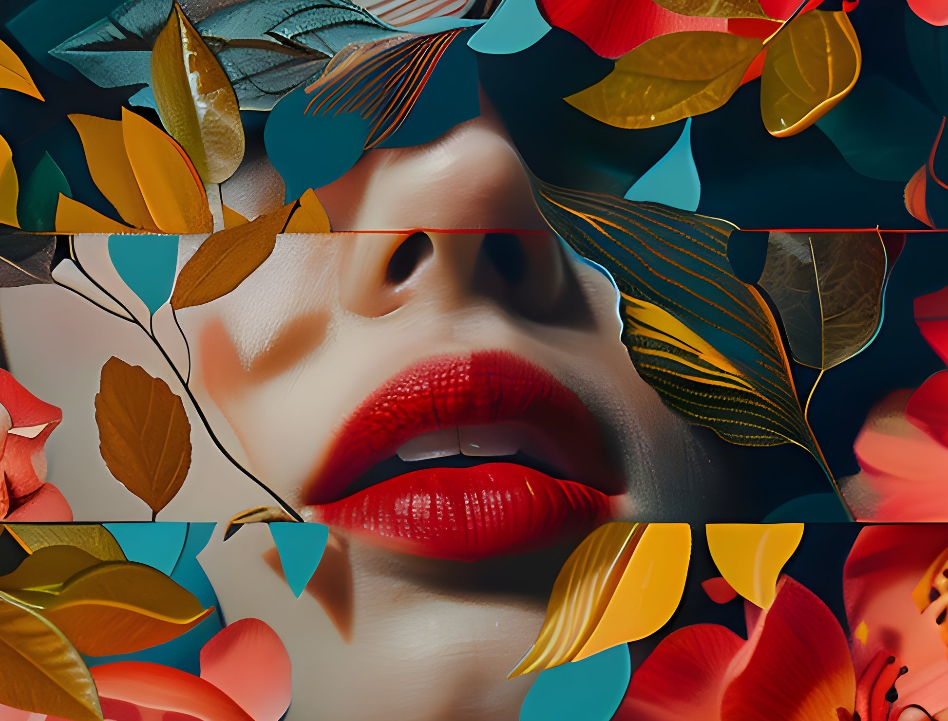 In "Floral Veil," Marta Ellie presents an enchanting fusion of portraiture and nature, blending the delicacy of blooming flowers with the subtle allure of human expression. Layers of lush petals and leaves intertwine with hints of a serene face, symbolizing the harmony between human beauty and the natural world. The rich reds, pinks, and deep greens create a striking contrast, inviting viewers to explore the mystery and depth within each layer.